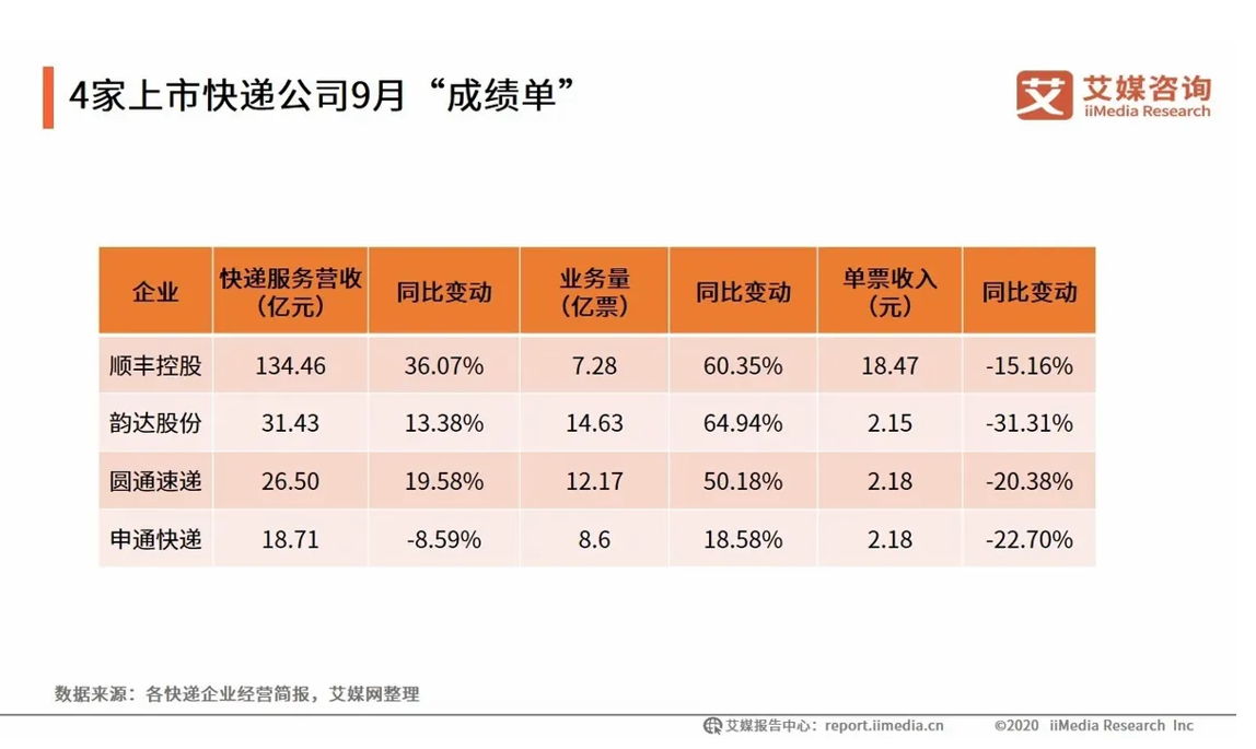 2020年,一只兔子闯入看似平静的中国快递市场凶狠地搅弄风云。在其“不要命”的低价打法之下,快递行业的单票价格普遍下降,据艾媒咨询统计,去年9月顺丰控股、韵达股份、圆通速递、申通快递的单票收入分别为18.47元、2.15元、2.18元和2.18元,同比变动分别为-15.16%、-31.31%、-20.38%和-22.70%。