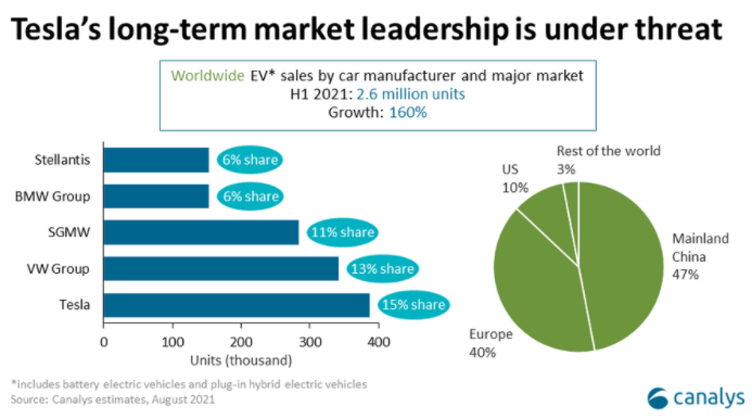 市场调查机构Canalys公布了全球上半年电动汽车市场的最新报告。报告称,尽管电动汽车供应受限,但上半年销量仍同比上升160%。根据电动汽车品牌分类,特斯拉以15%的市占率继续占据主导地位,德国大众汽车集团以13%的市占率位居第二,上汽通用五菱以11%市占率位居第三,其宏光微型电动车在中国获得巨大成功。宝马集团和Stellantis以6%的市占率位居第四和第五。