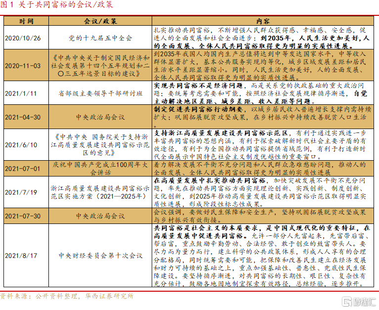 参照浙江意见和十四五规划,在收入分配领域的政策上:1)初次分配:重点在于促进高质量就业,提高劳动报酬比重,创新要素参与分配,保护知识产权,推进反垄断和规范资本有序扩张持续进行;2)再分配:加大税收、社保、转移支付等调节力度并提高精准性,扩大中等收入群体比重,增加低收入群体收入,合理调节高收入,取缔非法收入,形成中间大、两头小的橄榄型分配结构,预计后续房地产税立法改革持续推进;3)三次分配:是初次分配和再分配的补充,通过三次分配加强对高收入的规范和调节,鼓励高收入人群和企业更多回报社会。具体落实方面,预计会有设立新型捐赠方式、完善慈善褒奖制度、鼓励设立慈善信托、完善慈善捐赠监管、捐赠税收优惠等政策。