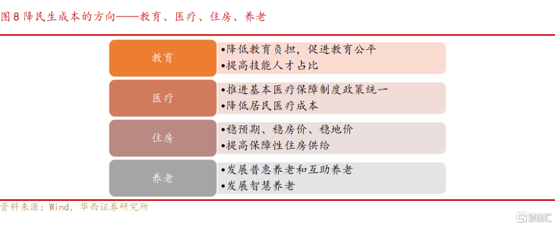 中央财经委会议强调,重点加强基础性、普惠性、兜底性民生保障建设、要促进基本公共服务均等化,加大普惠性人力资本投入,完善养老和医疗保障体系、兜底救助体系、住房供应和保障体系。政府作为资源分配的主角,在公共政策和财政政策上,料将继续加大对于居民的基本保障力度,提高对于民生领域和公共服务保障领域的支持力度,聚焦教育、医疗、住房、养老领域,推进民生领域“补短板”,向生态文明建设、基层“三保”、节能减排、乡村振兴等重点领域倾斜。