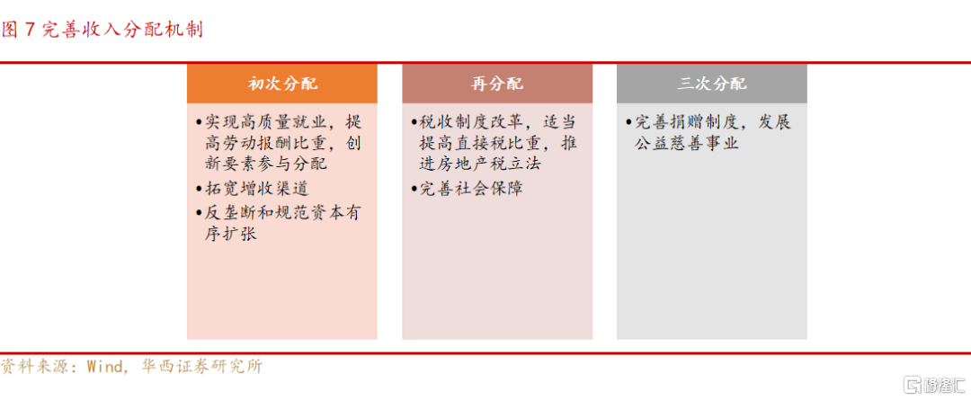 1)初次分配:重点在于促进高质量就业,提高劳动报酬比重,创新要素参与分配,保护知识产权,“反垄断”和“规范资本有序扩张”将持续进行;