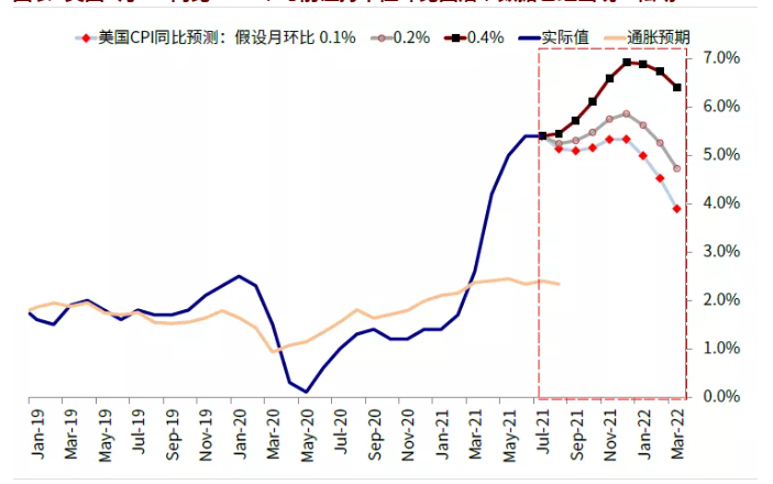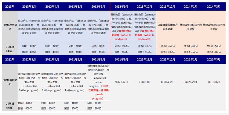 图表:我们整体预计年底(12月FOMC会议)大概率是美联储正式开始减量的时间点,而9月FOMC则有可能是美联储在官方声明首次暗示减量的时间节点