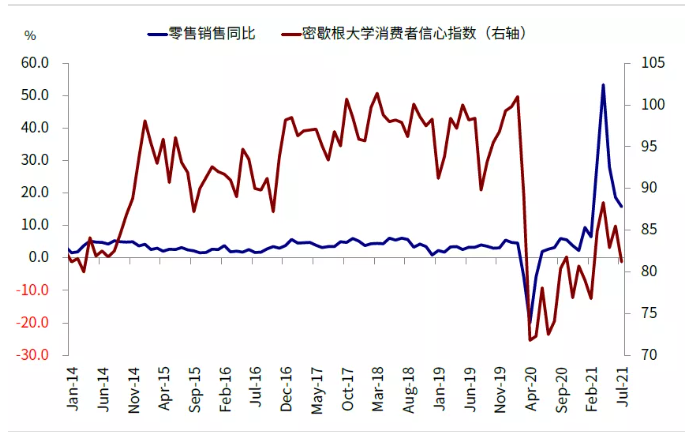 图表: 8月密歇根大学消费者信心指数意外下降,7月零售销售环比较前月同样回落