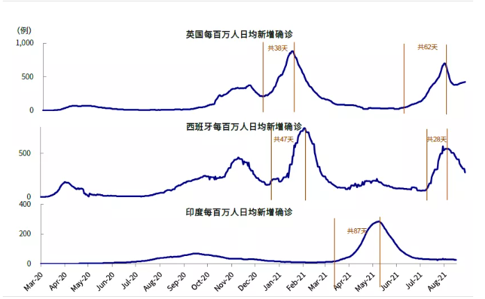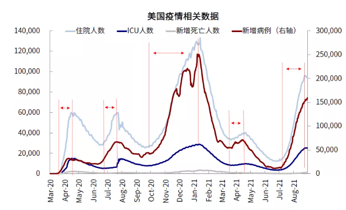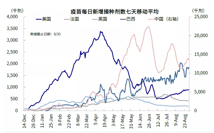 1) 疫情:不至完全失控但短期明显转好也有难度;不影响修复大局但会拉大不同市场间落差。美国Delta变异病毒还在继续且已经对短期增长造成拖累,例如美国的出行、票房、餐饮等高频指标、以及消费者信心和零售消费等数据,9月初公布的非农和通胀预计也有可能继续受其影响偏弱,进而阶段性的压制增长预期和利率。往前看,由于目前美国的新增还在爬升,根据此前新增加速到见顶大概需要四周左右时间的规律,疫情不排除要到9月中下旬逐步见顶。但给定目前加强针和美国疫苗接种有望再度提速,我们并不认为疫情会完全失控,而且美债利率前期已经计入了较为悲观的预期,因此也大概率不会再交易这个变化,只不过在新增见顶前也很难从这个维度提供正向支持罢了(《美国疫苗接种有望加速》、《疫苗加强针能起多大作用?》)。