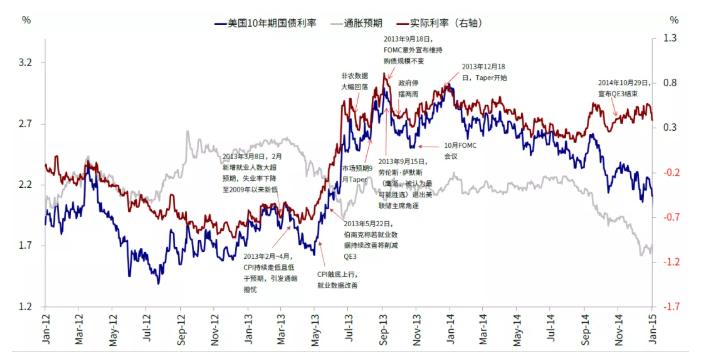 图表: 对于利率而言,历次美联储货币政策操作不论是QE还是加息都是预期先行,因此在暗示阶段有可能成为促使利率在实际利率推送下再度上行的契机和催化剂