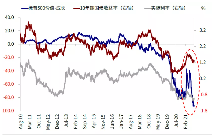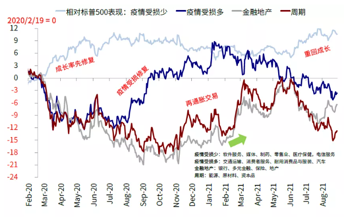 回顾看,8月以来全球市场在通胀、增长和利率等多个维度的演绎均符合我们此前的判断:例如通胀虽然还是一个“麻烦”但7月数据显示已经出现松动(我们认为市场可能高估了短期的通胀担忧);月初美国依然强劲的就业数据一度推动美债利率快速走高(我们预期市场或高估了疫情对增长的冲击导致利率创新低,并提示关注如果实际情况没那么差的话实际利率的快速反抽)。这一宏观环境使得再通胀交易主导的大宗商品和类滞胀交易下的黄金和实际利率基本都“偃旗息鼓”,新兴市场跑输,而能提供优质稳定现金流的成长股则明显跑赢,这与我们在7月和8月资产配置月报中的判断都基本一致的((《海外资产配置月报(2021-8)短暂的类滞胀交易》、《海外资产配置月报(2021-7)再通胀交易的回落》))。