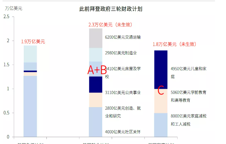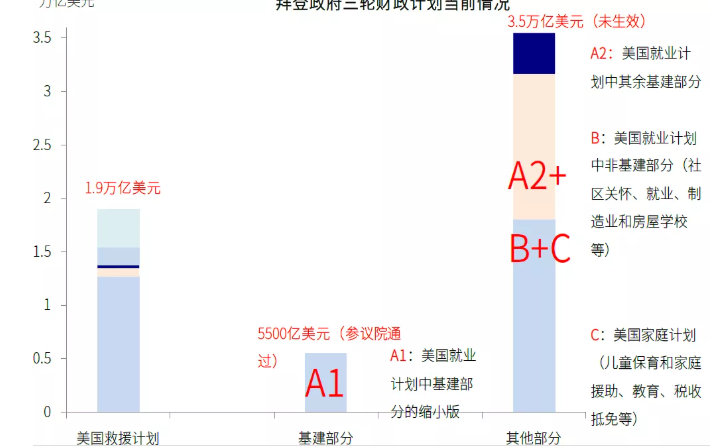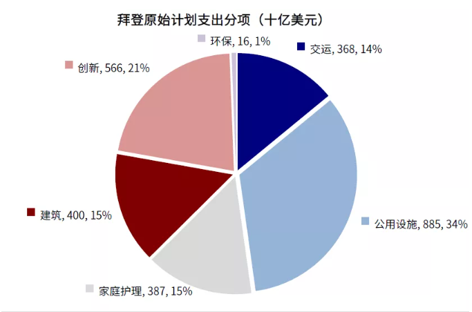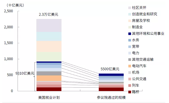 图表:参议院通过的5500亿美元新增基建是此前2.3万亿美元美国就业计划中实体基建部分的缩略版本