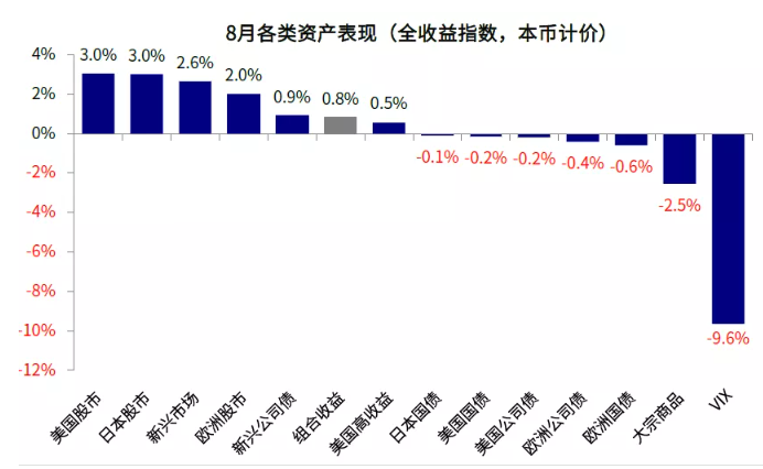 图表: 8月,美股以及新兴市场股市是组合8月上涨的主要贡献 ,VIX及大宗商品有所拖累