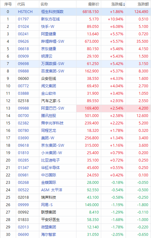 其中,新东方在线涨超10%,快手涨超6%,阿里健康、京东健康、百度、哔哩哔哩涨超5%,阿里、腾讯涨超2%。