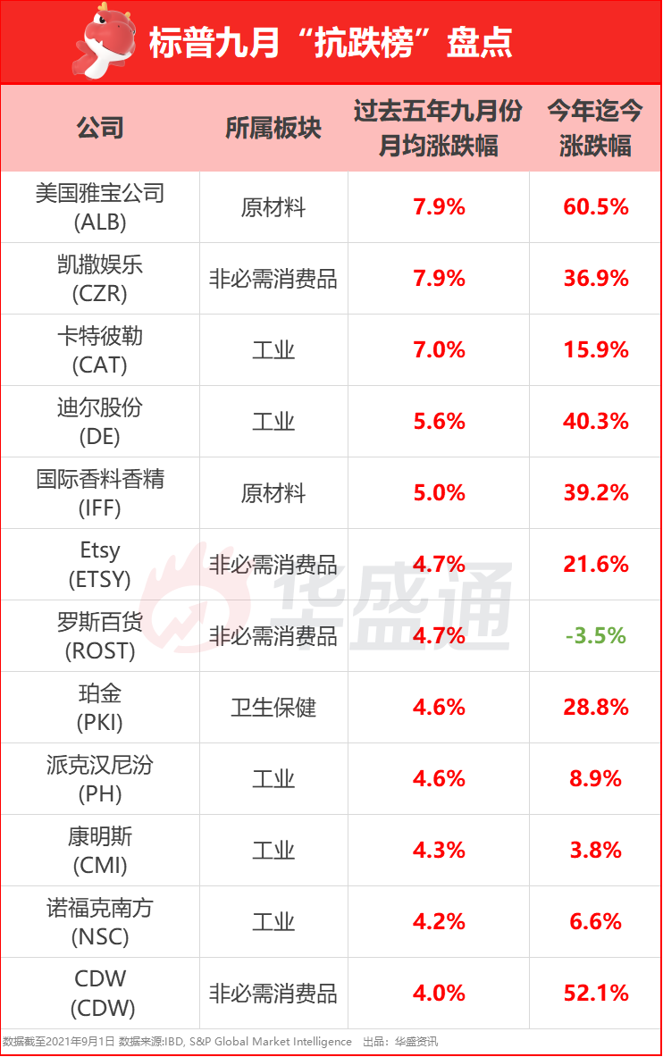 研究还发现,在过去5年中,有12只成分股9月股价表现一直跑赢标准普尔500指数,其中5只均属于工业类股票。