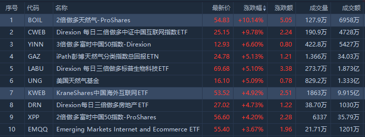 具体表现在ETF方面,涨幅靠前的ETF有2倍做多天然气ETF $BOIL 上涨10.14%,成交额达6958万美元;iPath彭博天然气分类指数总回报ETN $GAZ 涨超5.13%。