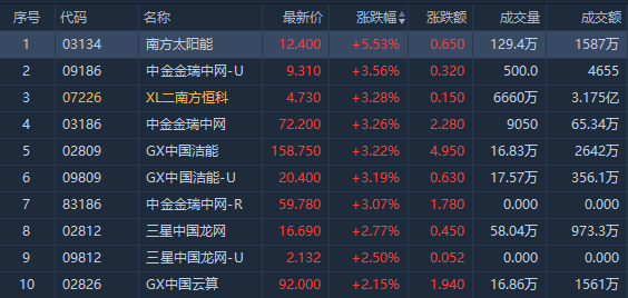 今日涨幅居前的ETF有南方太阳能 $03134.HK 大涨5.53%,成交额1587万港元;南方二倍做多恒科 $07226.HK 大涨3.28%。