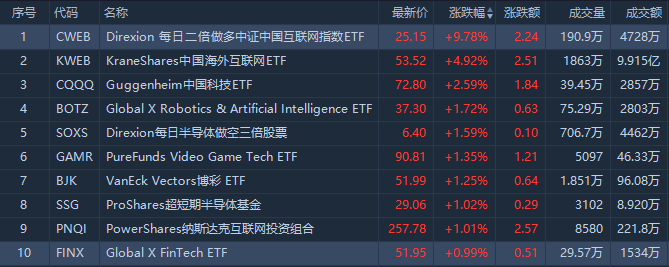 具体到ETF方面,Direxion每日二倍做多中证中国互联网指数ETF $CWEB 上涨9.78%,成交额达4728万美元;Guggenheim中国科技ETF $CQQQ 涨2.59%,成交额2857万美元。