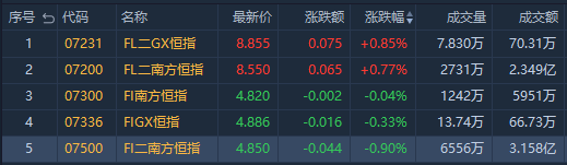 跌幅居前的有南方二倍看空恒指 $07500.HK 跌0.9%,成交额3.158亿港元。