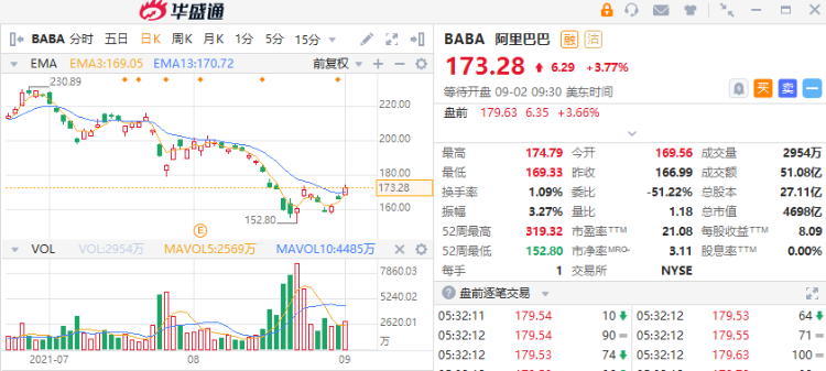 华盛资讯9月2日下午消息,截至发稿,阿里巴巴美股盘前涨近4%,此前有报道称,公司宣布将投入1000亿元助力共同富裕。