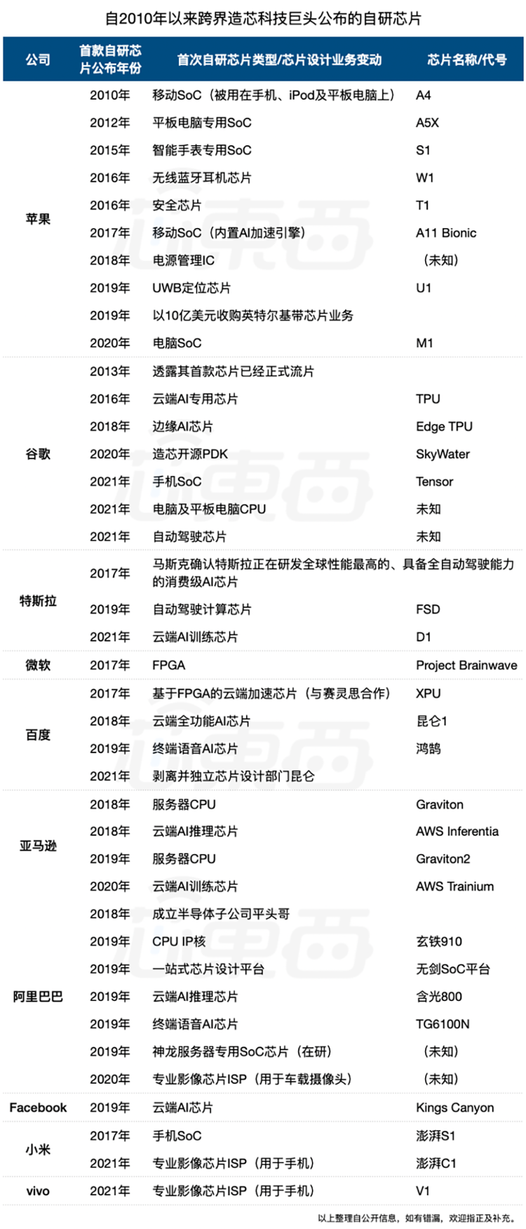 自2010年以来跨界造芯的科技巨头公布的自研芯片