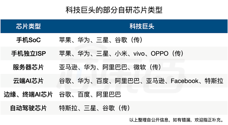 科技巨头的部分自研芯片类型