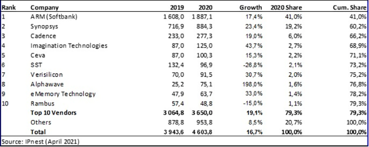 2020年芯片设计IP市场份额(来源:Semiwiki)