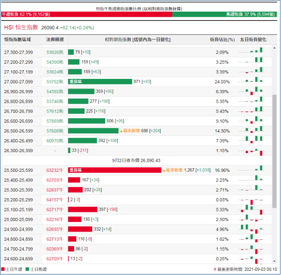 街货分布方面,至周四,恒指牛证街货在收回价25100点至25600点之间,累计相当约2035张期指合约;恒指熊证街货在收回价26400点至26900点之间,相当约2086张期指合约。