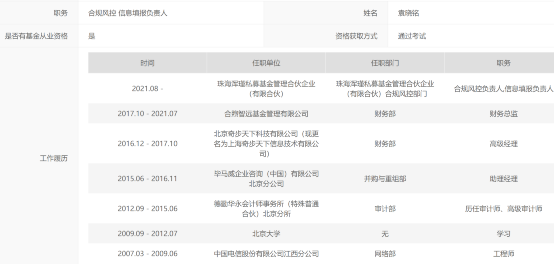 珠海浑瑾私募基金的合规风控负责人袁晓铭,曾经在德勤、毕马威两大会计事务所都工作过,还曾任360旗下北京奇步天下科技有限公司的财务总监;2017年10月加入合煦智远基金,担任财务总监,直到2021年7月离开。