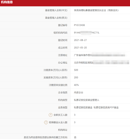 基金业协会信息显示,一家名叫“珠海浑瑾私募基金管理合伙企业(有限合伙)”的机构在今年8月27日完成备案登记,类型是私募证券投资基金管理人,目前公司有全职员工3人。这家新锐私募基金今年5月20日刚刚成立,注册资本500万,实缴资本200万,注册在广东珠海市,办公在北京朝阳区。