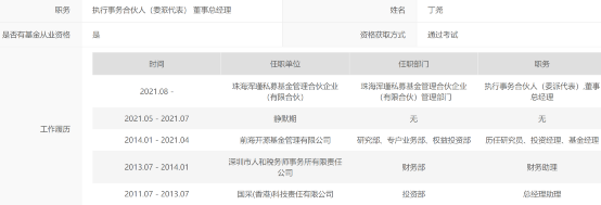 今年4月丁尧离开前海开源基金,随后“奔私”,跟李岳一起创立了珠海浑瑾私募基金,成为公司执行事务合伙人(委派代表)、董事总经理。