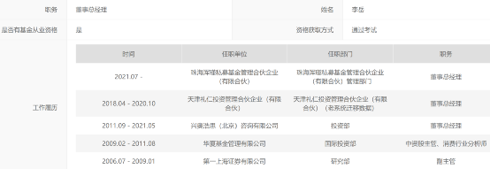 公开资料显示,李岳具有15年的金融从业经验,2006年7月加入第一上海证券担任研究部副主管;2009年2月他进入头部公募华夏基金,在国际投资部担任中资股主管、消费行业分析师;2011年9月成为兴奥浩思(北京)咨询有限公司投资部董事总经理;2018年4月加入百亿私募天津礼仁投资,担任董事总经理;2021年他创立了自己的私募公司,成为珠海浑瑾私募基金管理合伙企业(有限合伙)的董事总经理。