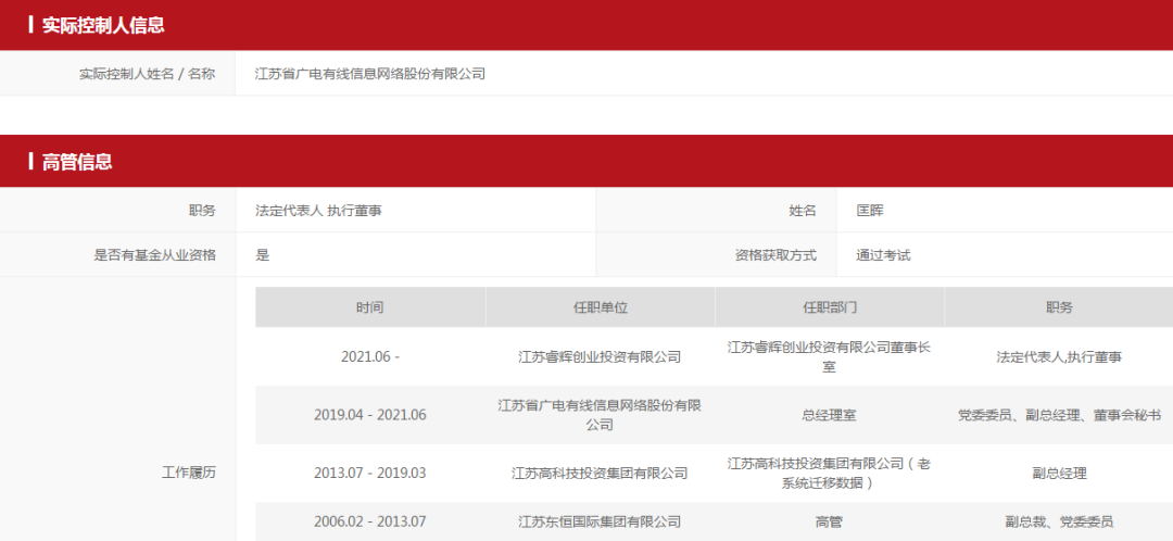 中基协备案信息显示,睿辉投资的实际控制人是江苏省广电有线信息网络股份有限公司(下称“江苏有线”)。而睿辉投资的法定代表人、执行董事匡晖于2019年4月至2021年6月,在江苏有线任党委委员、副总经理、董事会秘书。