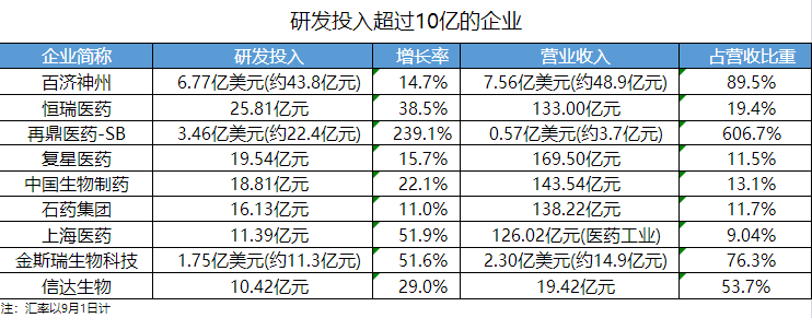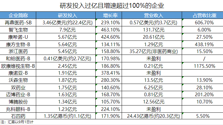 98家药企研发投入过亿,9家超10亿(去年同期5家);近8成药企研发投入呈正增长,27家暴涨超100%;创新型企业主导,9家药企研发投入占营收比重超过100%。