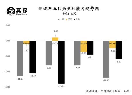亏损情况方面,财报显示2021年二季度小鹏净亏损11.9亿,在三家中亏损情况最为严重;蔚来净亏损达到5.87亿元,环比增加超过3成;三家中,理想汽车亏损最少并呈减少的态势,本季度理想净亏损2.355亿元,环比减少超过3成。