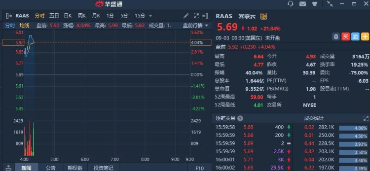 华盛资讯9月3日讯,美股盘前,热门中概股涨跌不一,容联云涨超4%,花旗表示,容联云第二季度营收同比增长48%至2.74亿元人民币,较营收指引高出6%,展望第三季度,预计营收为2.75-2.78亿元人民币,同比增长44-45%。