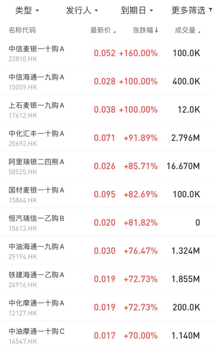 涨幅居前的包括: $22810.HK 中信麦银一十购A涨160%,占据排行榜第一, $15059.HK 中信海通一九购A涨100%; $17612.HK 上石麦银一九购A涨100%。