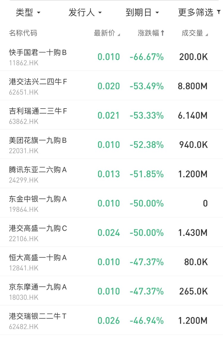 在今日跌幅榜中, $11862.HK 快手国君一十购A跌66.67%; $62651.HK 港交法兴二四牛F跌53.49%。