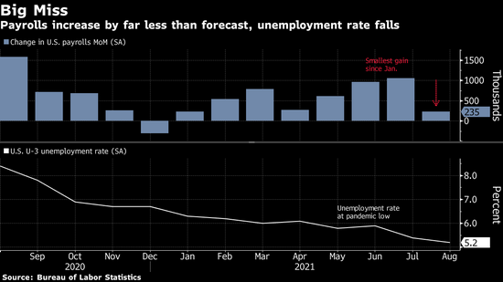 劳工部周五发布的数据显示,8月份非农就业人数增加23.5万人,7月份数据上修为增加105万人。在德尔塔病毒变种蔓延、招聘持续困难的情况下,最近强劲增长的休闲和酒店行业就业表现趋平。