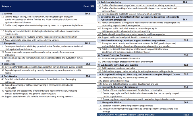 该计划呼吁在未来十年投资653亿美元,以改善疫苗、治疗药物以及公共卫生基础设施,提高国家的实时监测能力,并对个人防护设备进行升级。