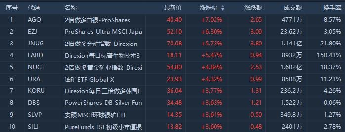 从ETF涨幅榜来看,涨幅居前的ETF集中在做多黄金白银。其中,2倍做多白银涨 $AGQ 超7%,成交额4771万美元;2倍做多金矿指数 $JNUG 涨近6%,成交额1.14亿美元。