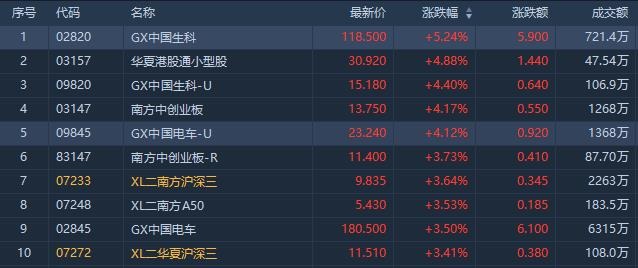 今日港股市场,涨幅居前的有GX中国生科 $02820.HK 涨超5%,成交额721.4万港元;南方中创业板 $03147.HK 涨超4%,成交额1268万港元。