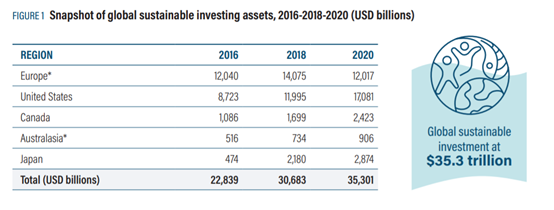 随着“可持续资产”成为政府、养老金以及企业降低碳排放足迹和更好履行社会责任的首选,ESG概念获得官方机构和资金火热追捧,光是欧美澳加日的可持续投资资产到2020年底已经达到35.3万亿美元,较2016年上升超50%。