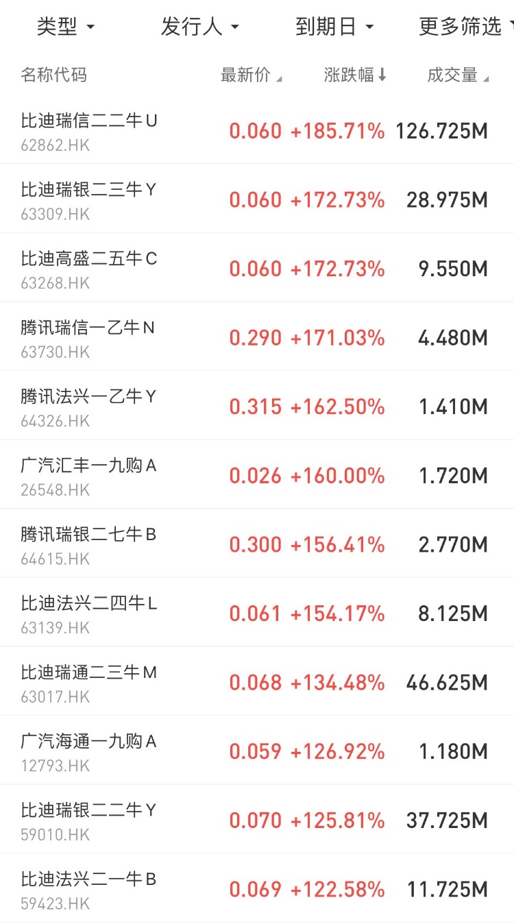 涨幅居前的包括:$62862.HK 比迪瑞信二二牛U涨185.71%,占据排行榜第一, 比亚迪股份$01211.HK 共有8只牛证涨超100%;$63730.HK 腾讯瑞信一乙牛N涨171.03%。