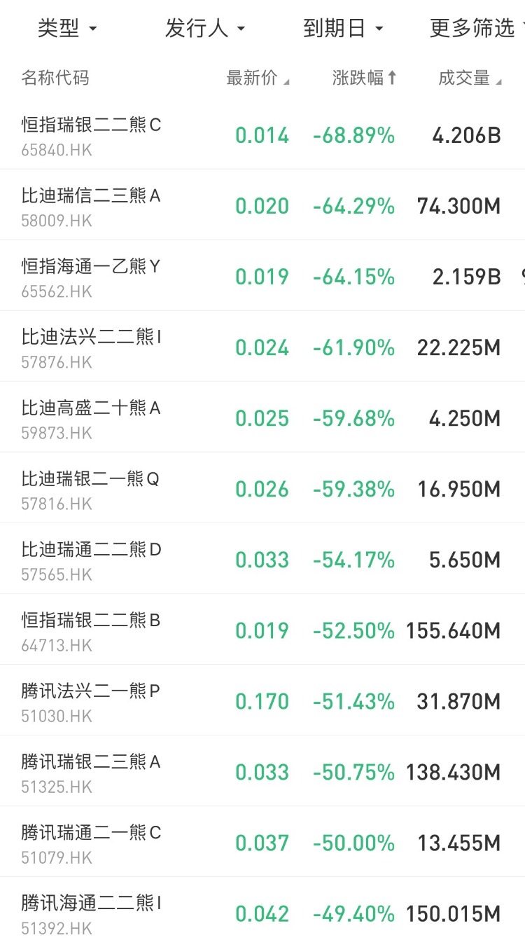 在今日跌幅榜中,$65840.HK 恒指瑞银二二熊C跌68.89%;$58009.HK 比迪瑞信二三熊A跌64.29%。