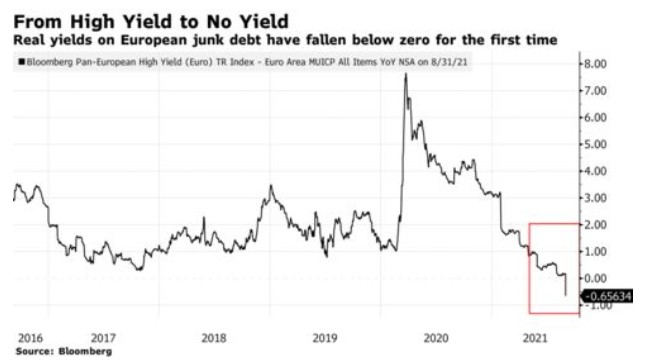 在欧元区8月份消费者价格飙升至十年高位之后,垃圾债券经通胀调整后的收益率首次变为负值,这让基金经理们不仅担心违约风险,还要担心价格增长。