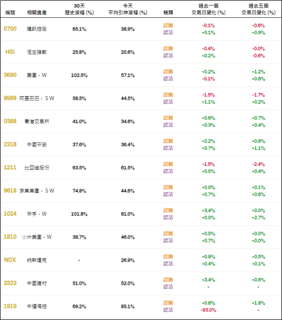 周一恒指相关权证的平均引伸波幅约20.6%,按日略有下降。个股方面,阿里、比迪相关认购证的引申波幅按日显著调降;相反,快手、中国建材相关购证的引申波幅则按日均调升达3.4%。