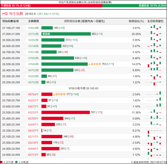 街货分布方面,至周一,恒指牛证街货重货区在收回价25400点至25900点之间,累计相当约1496张期指合约;恒指熊证街货重货区在收回价26600点至27100点之间,累计相当约2271张期指合约。
