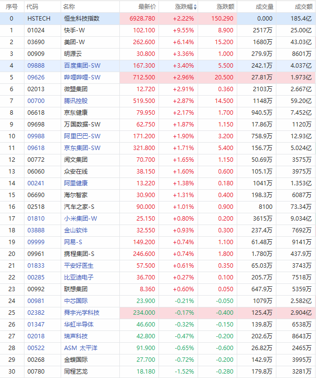 其中,快手上涨9.55%;美团上涨6.14%;明源云、百度集团涨超3%;哔哩哔哩、腾讯控股、京东健康涨超2%;阿里巴巴、阿里健康、京东集团等涨超1%。