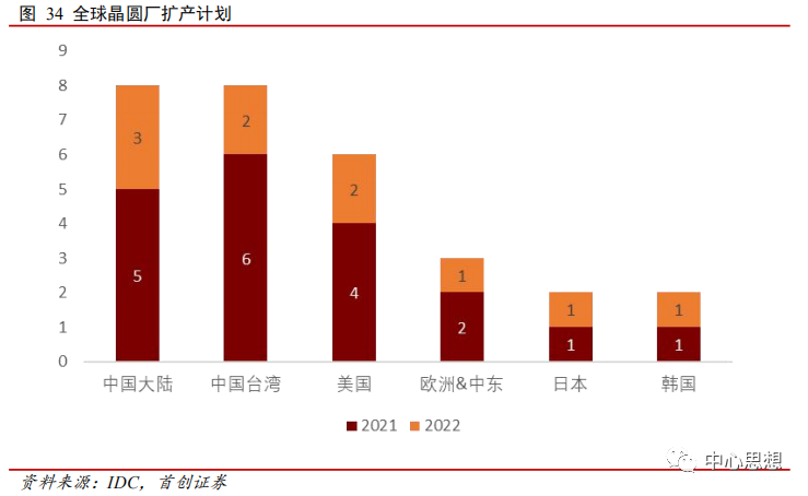 2020年12月三星的晶圆装机容量最大,每月为310万片8寸当量晶圆,占世界总容量的14.7%。我们由此测算2020年底全球晶圆厂产能约2108万片/月(等效8寸),未来两年新增260万片/月的产能,相当于全球产能在2020年底的基础上增加12.3%的产能。