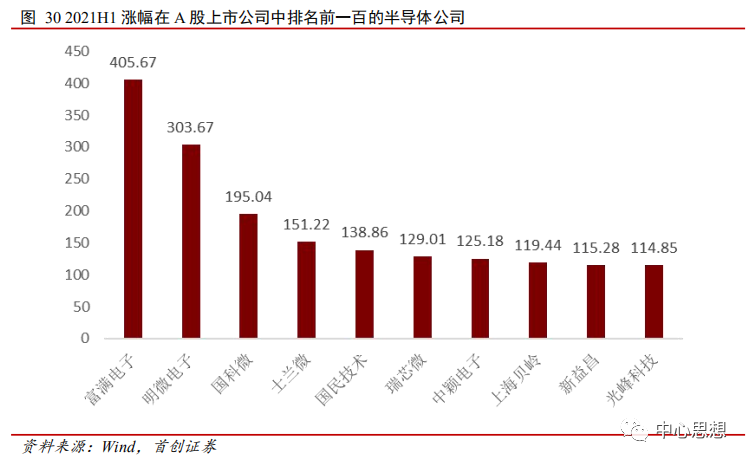 从个股表现来看,2021上半年A股所有上市公司涨跌幅排名中,半导体公司表现亮眼。富满电子涨幅405.67%,是A股上半年涨幅第二大公司。明微电子涨幅303.67%,是A股上半年涨幅排名第九的公司。在涨幅前一百的公司中,半导体公司占据了10%。