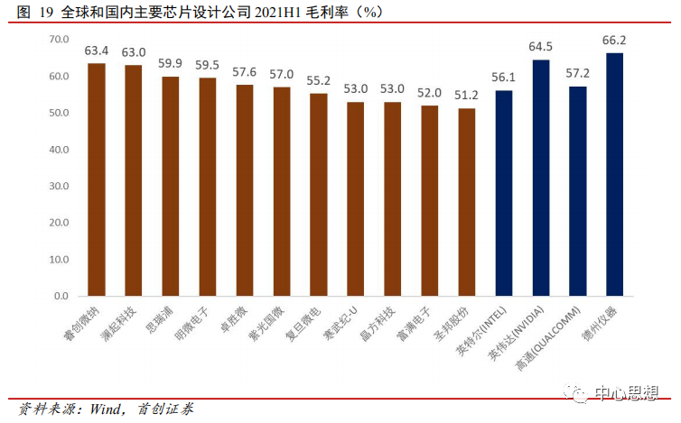将全球和国内主要芯片设计公司2021上半年毛利率做对比,也可以看出国内领先的芯片设计公司毛利率比如睿创微纳、澜起科技、思瑞浦、明微电子毛利率分别为63.4%、63%、59.9%、59.5%,都已经超过了英特尔的56.1%、高通的57.2%。
