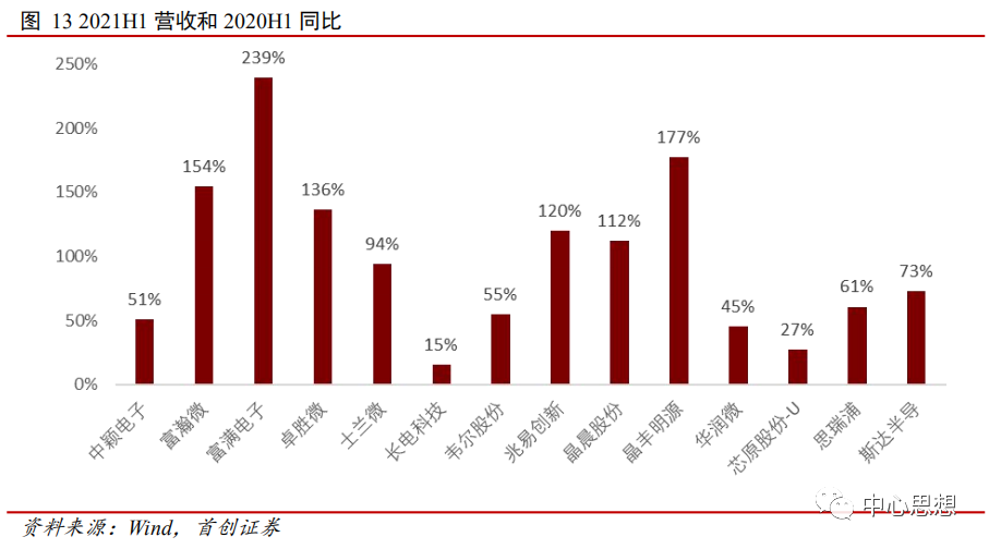 从主要半导体公司2021H1和2020H1同比来看,大部分公司增长迅速超过50%,其中富满电子同比增长239%、晶丰明源同比增长177%、富瀚微同比增长154%、卓胜微增长136%。