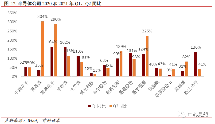从国内主要半导体公司2021上半年营业收入来看,公司2021Q1和Q2同比2020Q1和Q2上升均非常明显,其中富瀚微Q2同比上涨304%,富满电子Q2上涨290%,晶丰明源Q2同比上涨225%。