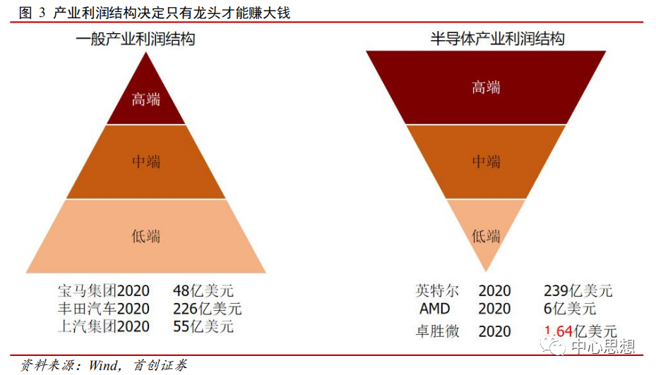 半导体产业与传统产业利润结构不同,只有龙头才能赚大钱,呈现一个倒金字塔形状。半导体产业的主要盈利集中在高端领域,国内厂商产品大多数还属于低端领域,本身盈利偏低。